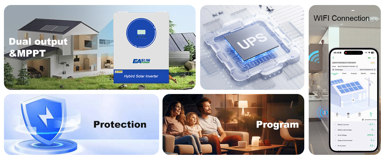 EASUN POWER 11kW — це надпотужне інтелектуальне рішення для створення повної енергонезалежності вашого будинку, офісу чи виробництва. Завдяки подвійному входу MPPT та потужності 11000 Вт, цей інвертор здатний одночасно живити енергоємну техніку (кондиціонери, електроплити, насоси) та ефективно заряджати акумуляторні блоки великої ємності.